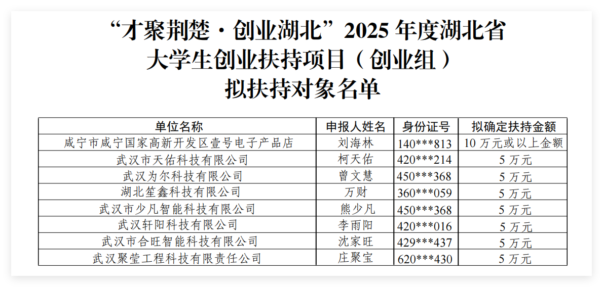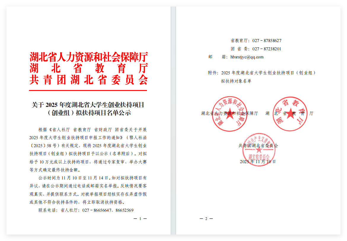 近日,2025年度湖北省大学生创业扶持项目名单正式公示。经过专家复审、大赛路演等复评环节,最终我校共有8个学生项目成功入选,共获45万元创业扶持资金,入选项目数量和获扶持金额均位居突破新高,充分展现了我校创新创业教育的扎实成效。